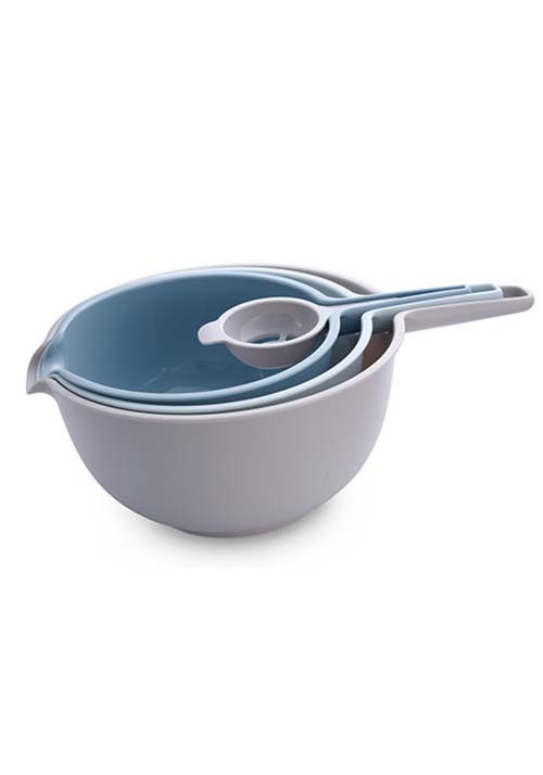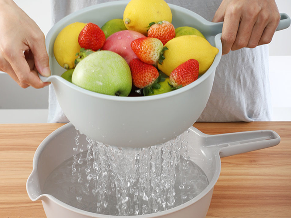 ハンドルで結合してコンパクトに収納できる、ボウル、コランダー(ザル)、エックセパレーターのセット!