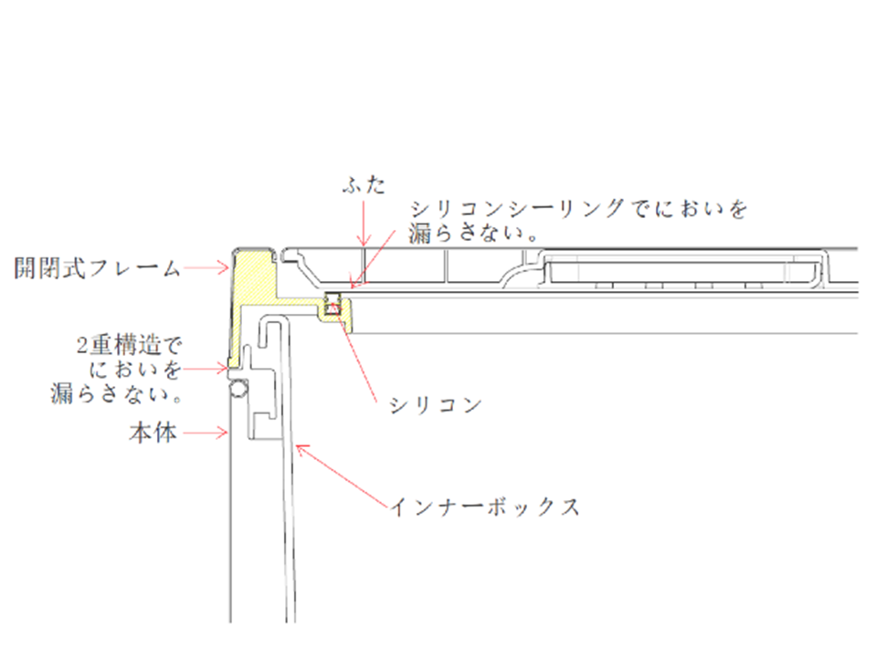 表面と開口部の抗菌加工で臭いの発生を抑えた上で更に二重の蓋が臭い漏れを防ぎます。